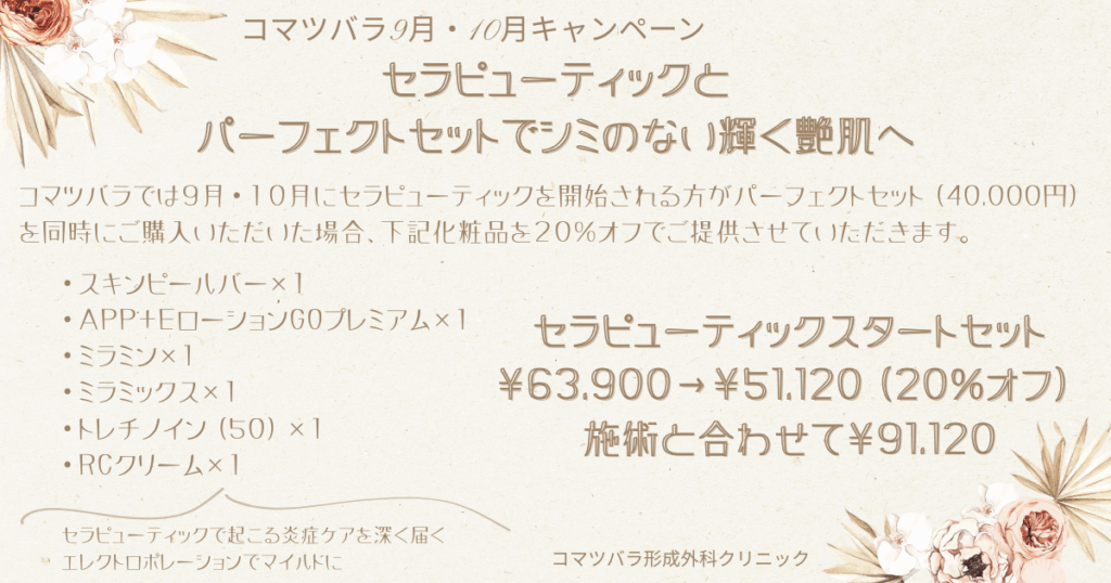「本気でシミケアしたい」方へ。この秋、肌が変わるチャンスです🍂 コマツバラでは10月末までセラピューティックとパーフェクトセットを同時購入すると対象アイテムが【20%オフ】❣️ 🌿スタートセット¥63… 続きを読む: しみ治療 セラピューティック+エレクトロポレーション