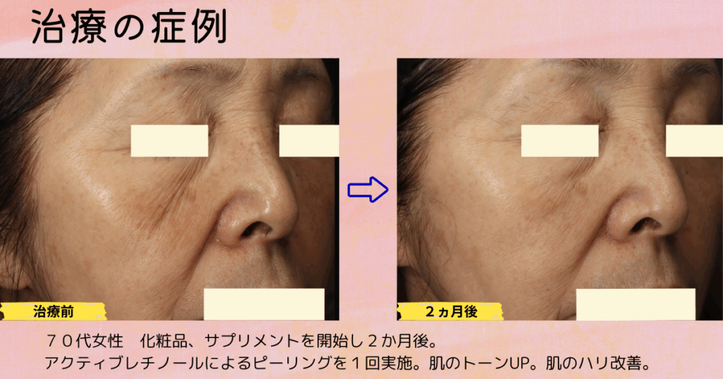 治療の症例をご紹介します。 70代女性化粧品とサプリメント、アクティブレチノールによるピーリングを行いました。 1か月経過のお写真では化粧品(Fジェル)とサプリメント(ワカサプリビタミンC+D)のみの… 続きを読む: 治療症例紹介 - 秋の「肌育」はじめませんか?