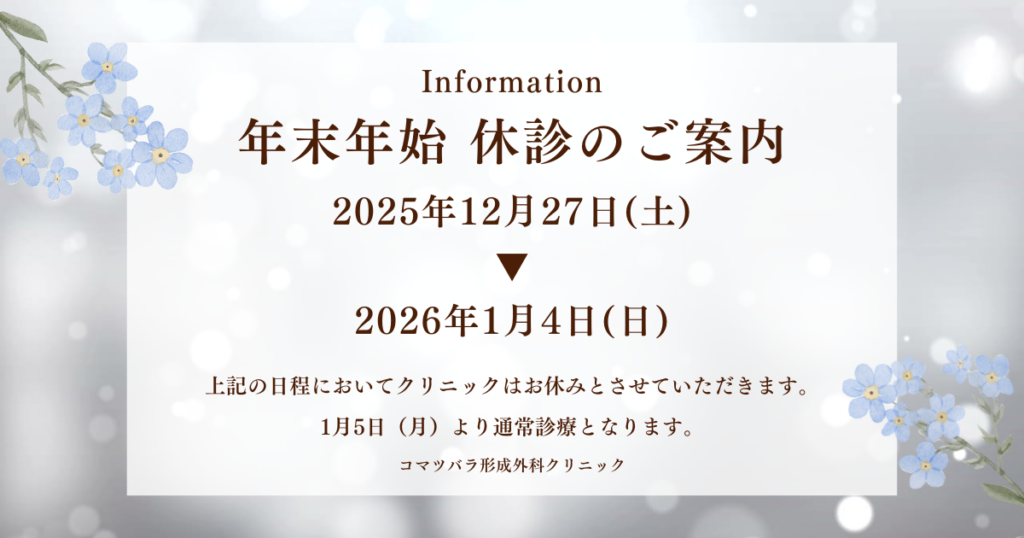 【価格改定のお知らせ】 平素よりコマツバラ形成外科クリニックをご利用いただき、誠にありがとうございます。原材料価格の高騰に伴い、2026年1月5日より一部メニューの価格を改定させていただきます。 今回… 続きを読む: 価格改定のお知らせ