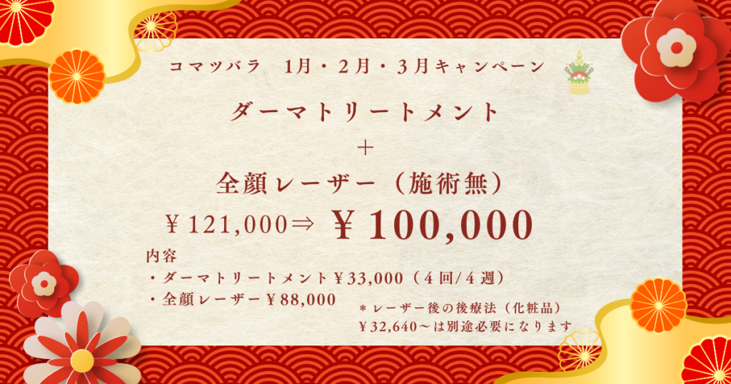 🎍1〜3月 新春キャンペーン🎍「肌の土台(真皮ケア)」×「表面の改善(レーザー)」を短期間で整えたい方におすすめのセットです✨ 💡ダーマ(4回/4週)+全顔レーザー通常 ¥121,000 → ¥100… 続きを読む: ダーマ+レーザー 新春キャンペーン - DENSITY(デンシティ)新規導入