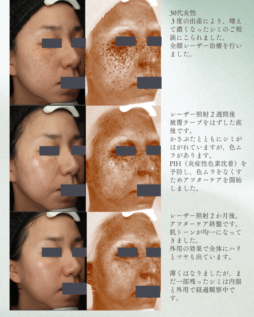 出産を経て濃くなったシミにお悩みで、全顔レーザー+ホームケア+内服を3ヶ月継続。