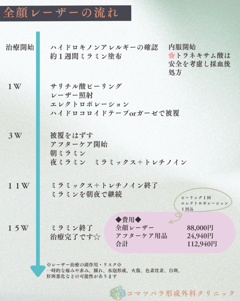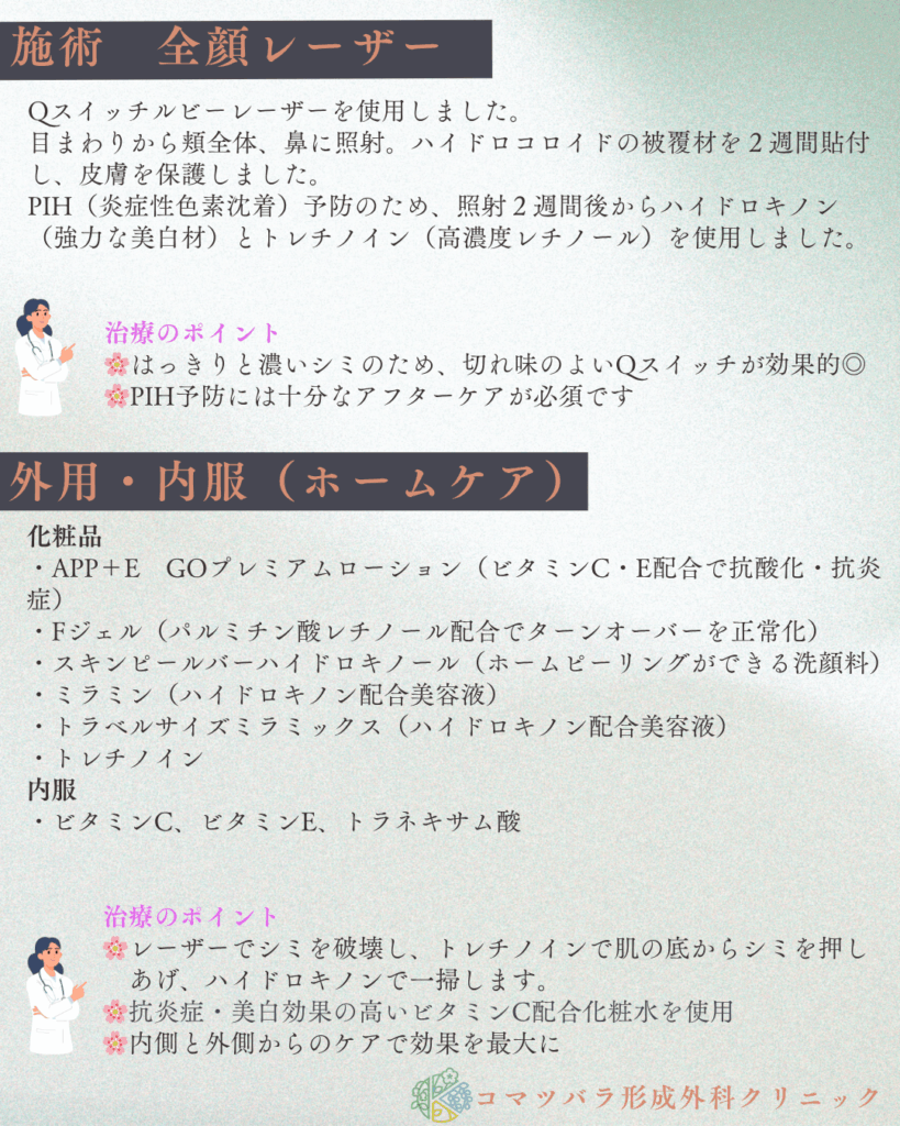 「コマツバラのしみレーザー治療」は、レーザー照射後の徹底したアフターケアで、炎症後色素沈着(PIH)を最小限に抑えます。