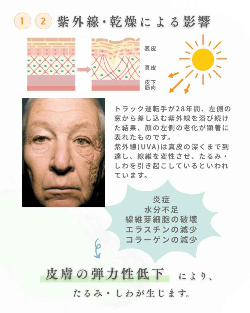 →炎症や水分不足、繊維が細胞の破壊やコラーゲン・エラスチンの減少により、皮膚の弾力性が低下し、たるみ・しわが生じます。