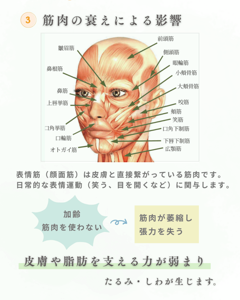 →加齢や筋肉を使わないことによって筋肉が萎縮し、張力を失うことにより、皮膚や脂肪を支える力が弱まりたるみ・しわが生じます。