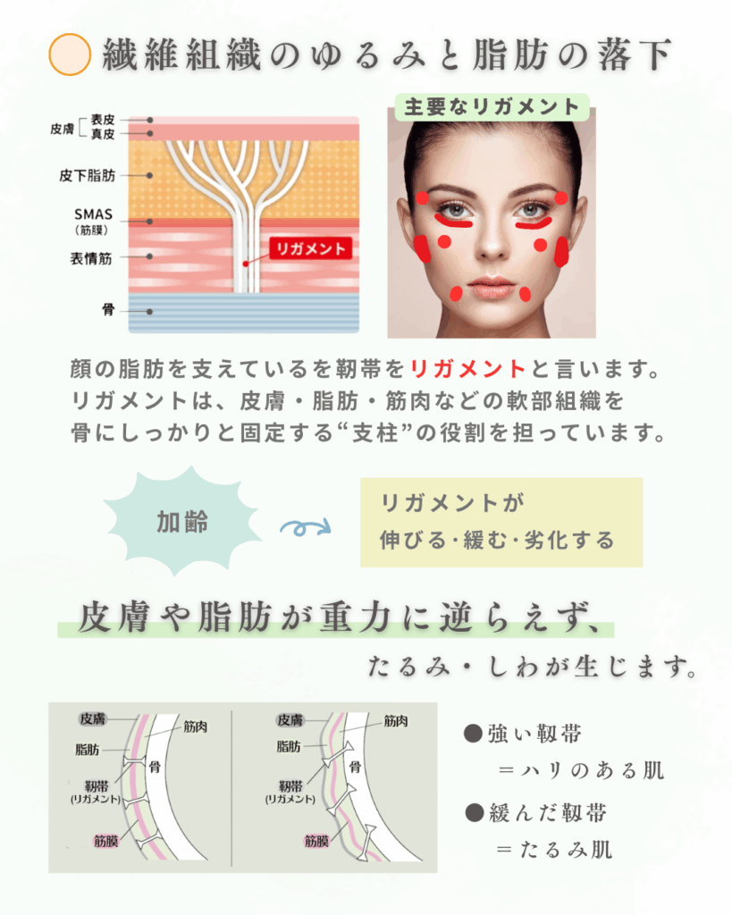→顔の脂肪を支えている靭帯をリガメントといい、支柱の役割を担っています。加齢によりリガメントが伸びたり緩んだりすることによって、皮膚や脂肪が重力に逆らえず、たるみ・しわが生じます。