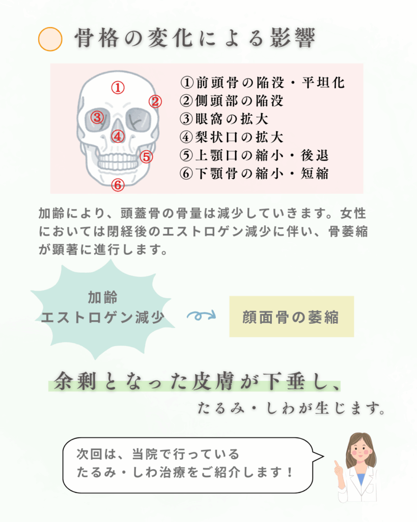 →加齢やエストロゲンの減少で顔面骨が萎縮し、余剰となった皮膚が下垂し、たるみ・しわが生じます。