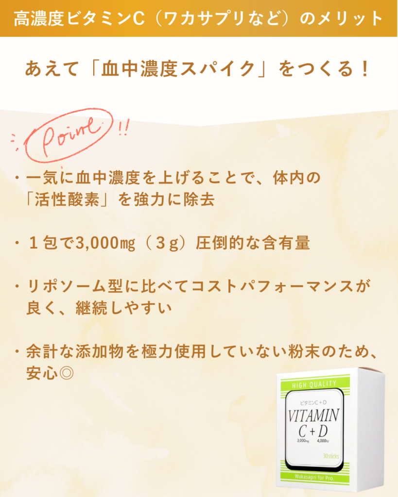 当院が採用しているワカサプリ ビタミンC➕Dの最大の特徴は、あえて「血中濃度のスパイク(急上昇)」を、作ること。