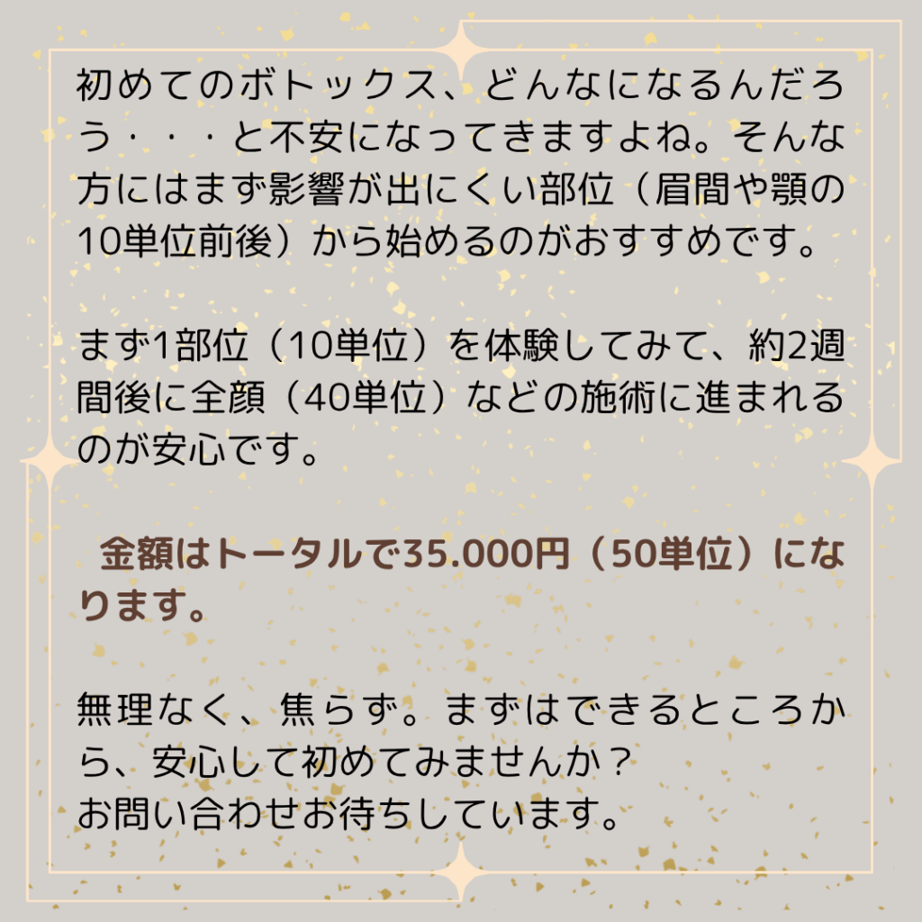 ボトックスは1か所だけでも効果を実感しやすい施術ですが、”顔全体のバランス”をみながら複数部位を調整することでより自然で洗練された仕上がりになります。