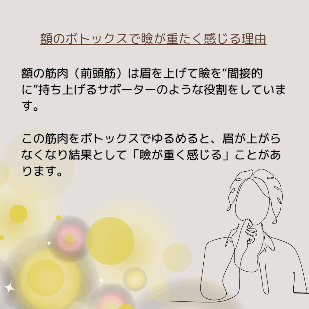 ボトックスでその筋肉をゆるめると、「しわ」は減っても「まぶたが開けづらく感じる」ことがあります。