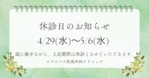 休診日のお知らせ 2026年4月25日 最終更新日時 : 2026年4月25日 komatsubara いつもご利用いただきありがとうございます。 誠に勝手ながら、下記期間は休診とさせていただきます。 ■休診期間4月29日(水)〜5月6日(水) 期間中はご不便をおかけいたしますが、何卒ご理解のほどよろしくお願いいたします。