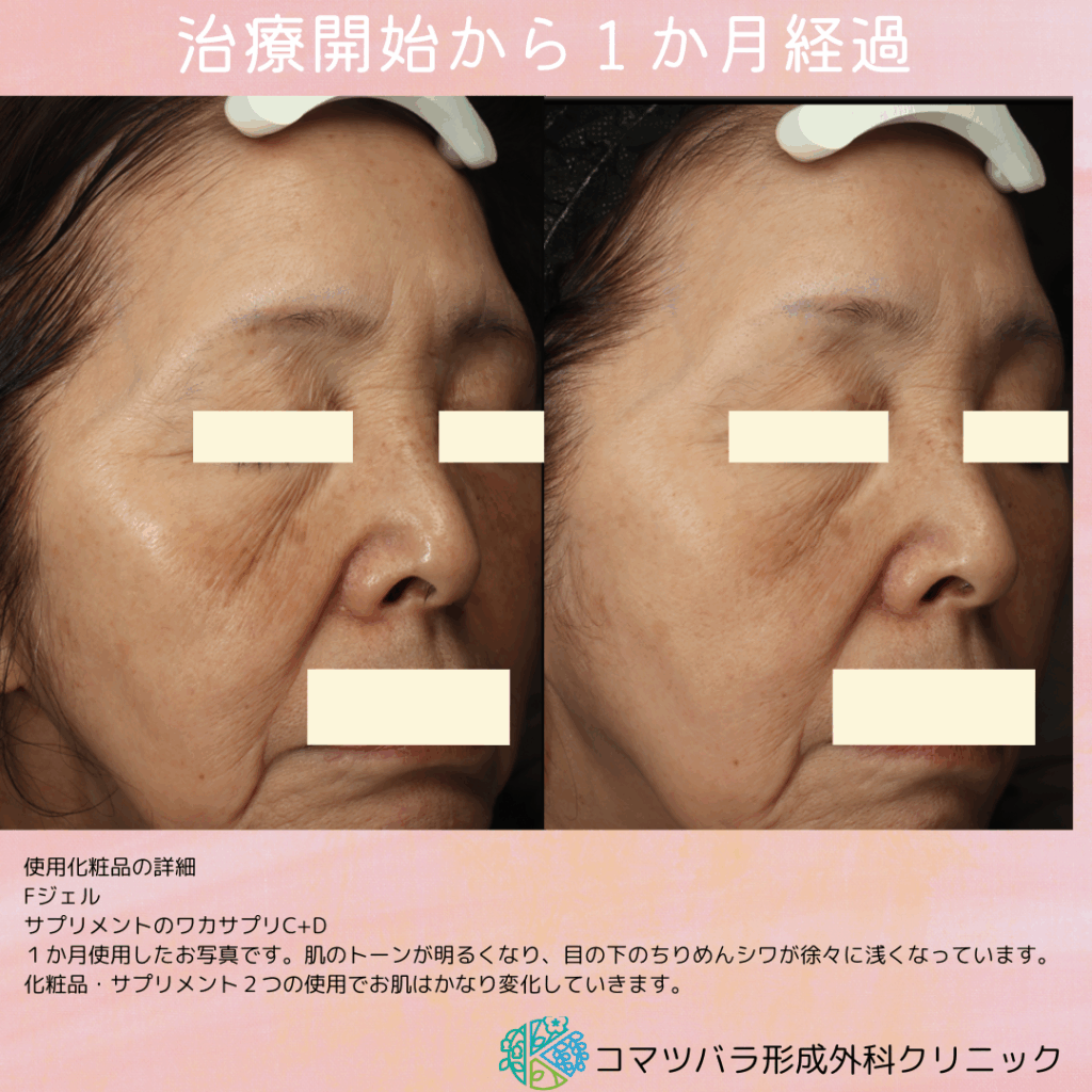 1か月経過のお写真では化粧品(Fジェル)とサプリメント(ワカサプリビタミンC+D)のみの使用で肌のトーンが明るくなり、目の下のちりめんシワが徐々に浅くなっています。