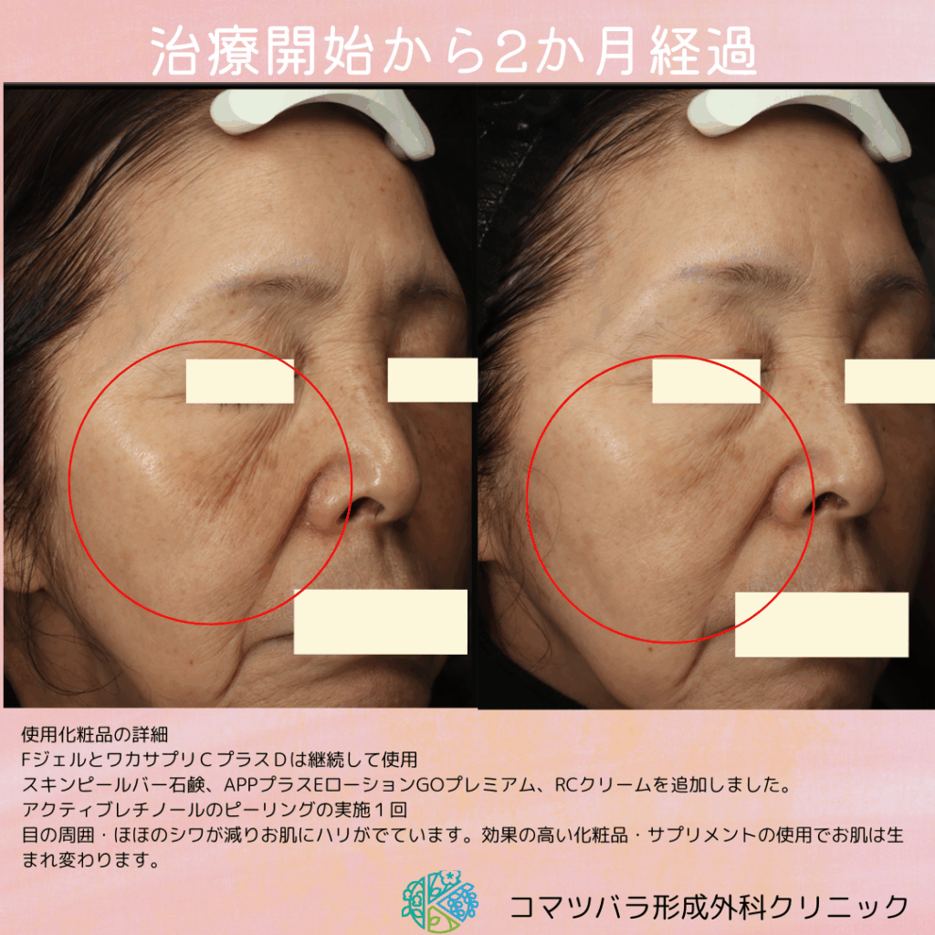 2か月経過のお写真は、1か月経過後に化粧品の追加とアクティブレチノールのピーリング後になります。目の周囲、頬のシワが減り肌にハリがでています。