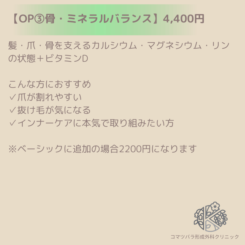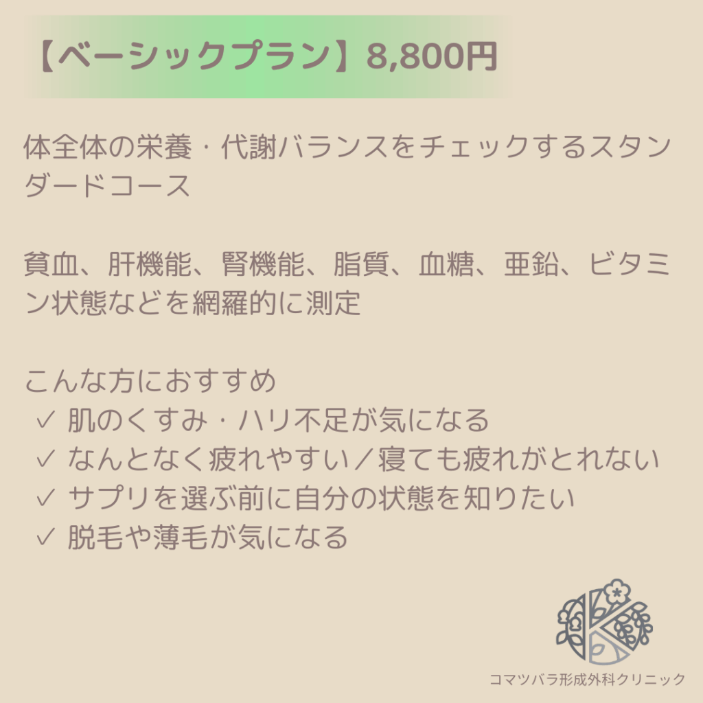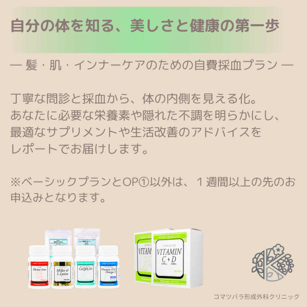 肌、髪、インナーケアのための自費採血プランのご案内です。