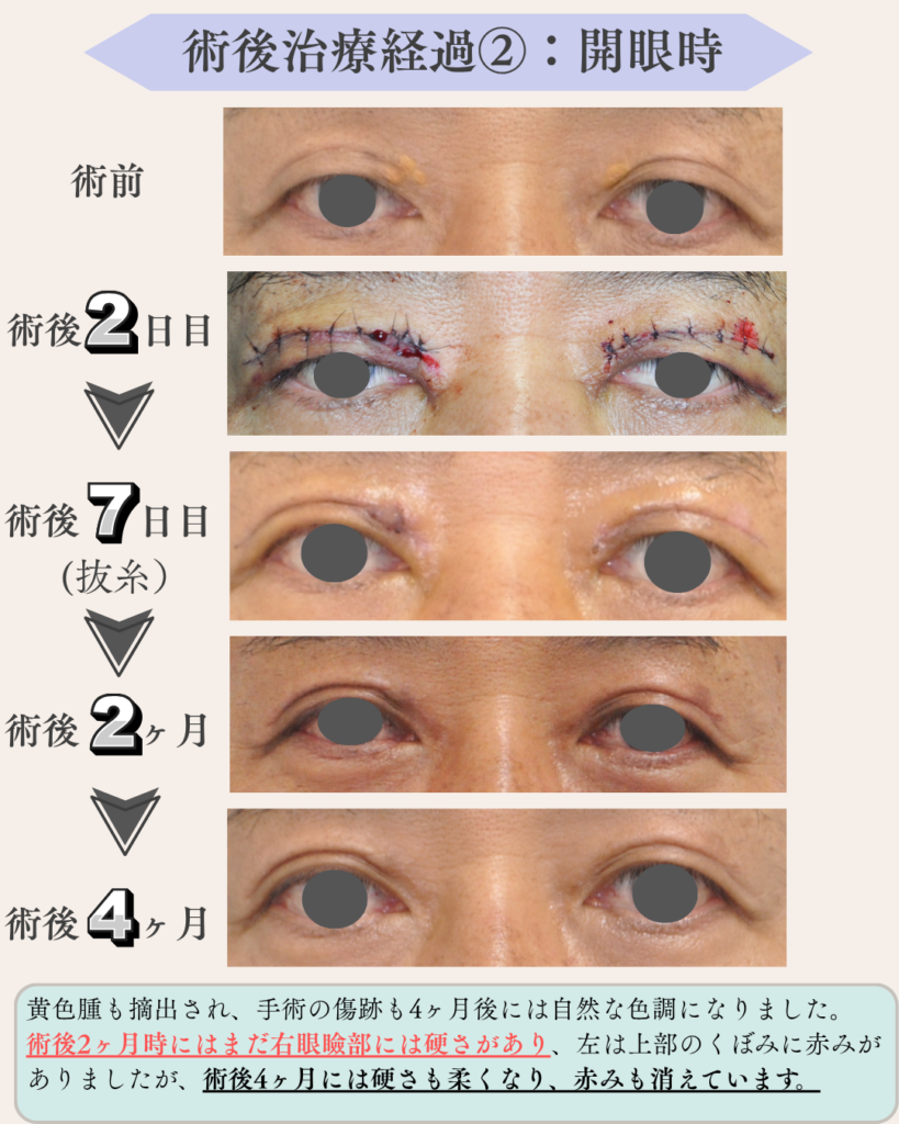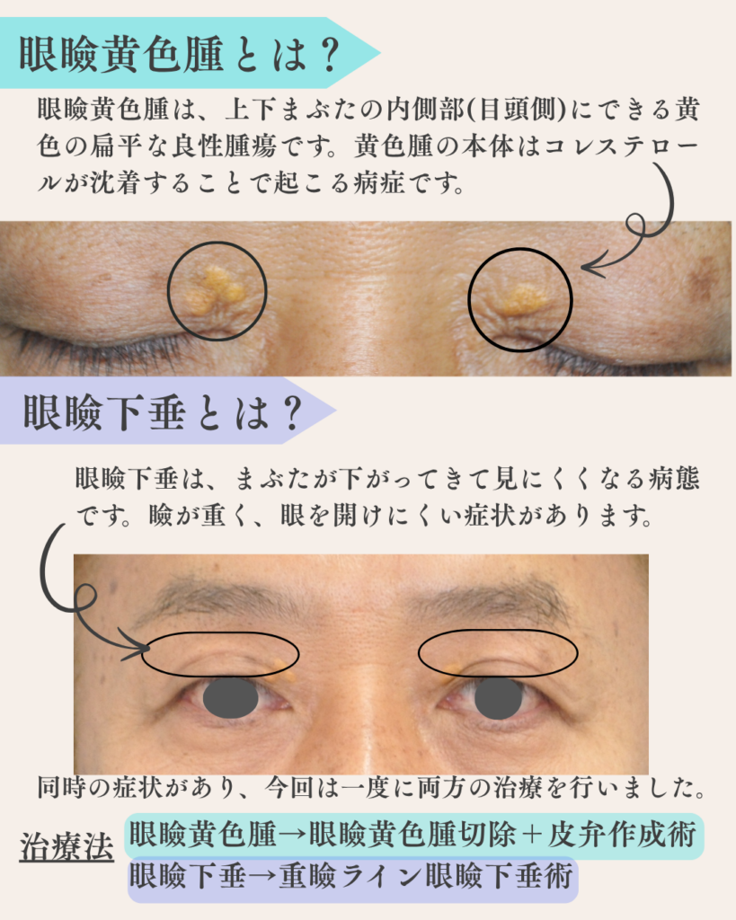 両側の上まぶたにできた黄色腫の切除術、さらに両側眼瞼下垂術を同時に行った患者様をご紹介します。