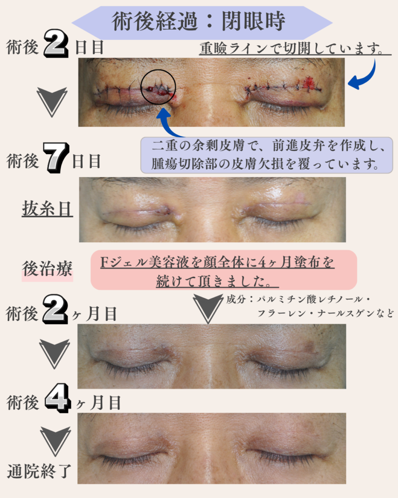 症例の患者様は眼瞼下垂の症状も認められたため、黄色腫を切除後一部皮弁作成を行い、重瞼ライン眼瞼下垂術を行いました。