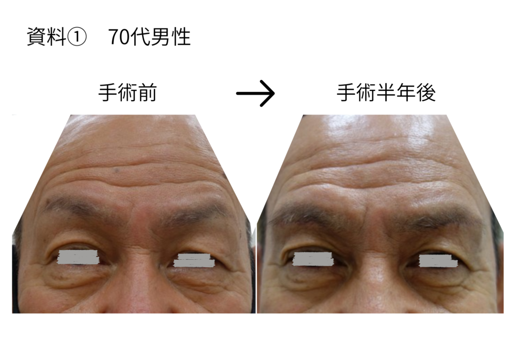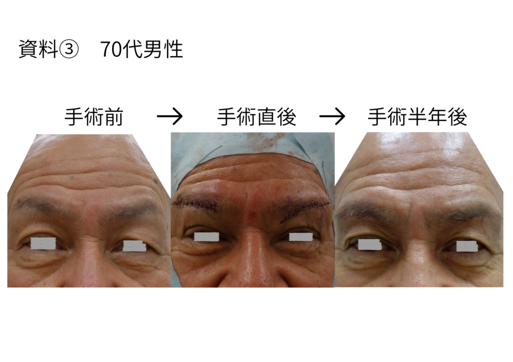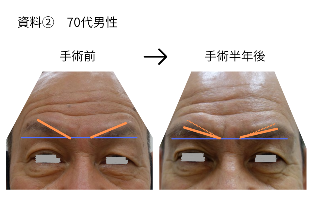 資料③ 手術直後はぱっちりと目が開いていても、半年が経過すると、眉の位置が下がることによって再びまぶたが被さってくるケースがあります。これは額の筋肉の、使い方の変化によるものです。