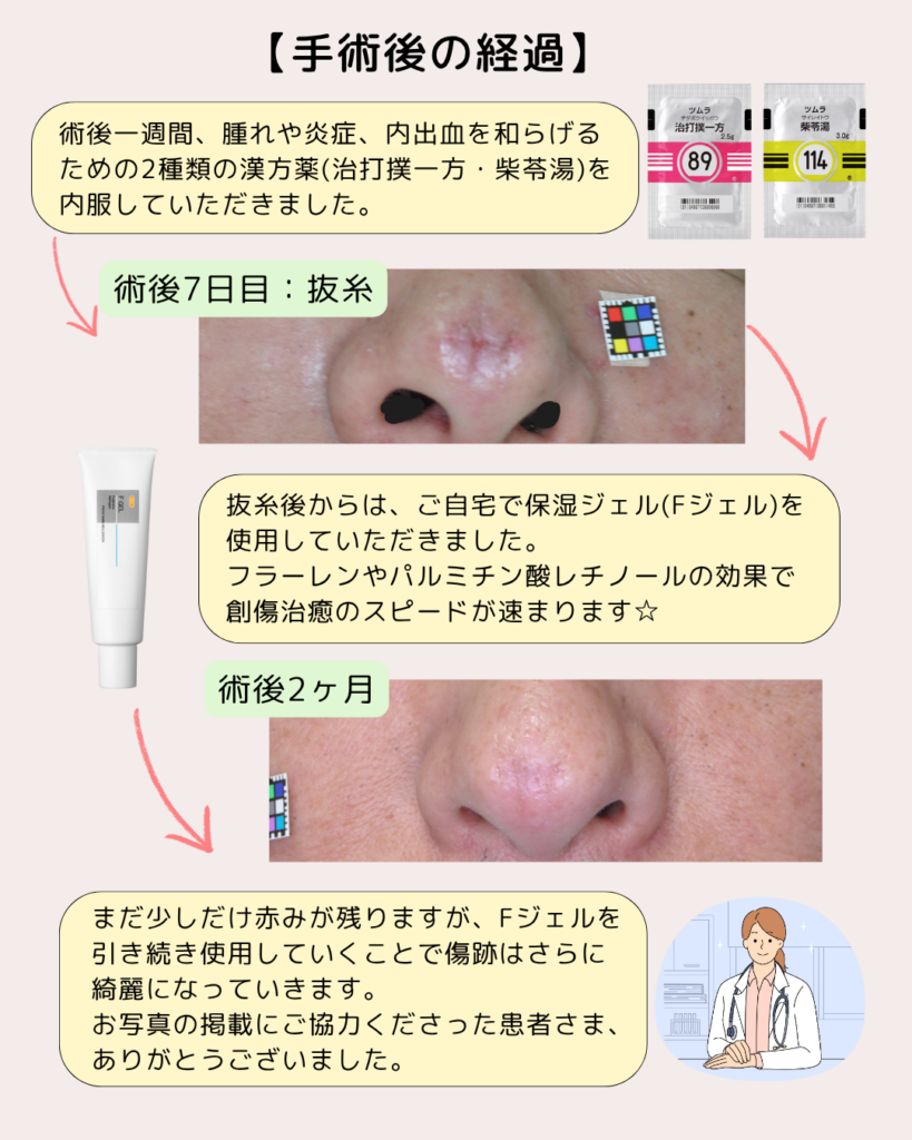 手術後は腫れや内出血を和らげる2種類の漢方薬(治打撲一方、柴苓湯)、保湿ジェル(Fジェル)を使用していただきました。